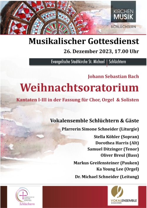 Am 2. Weihnachtsfeiertag (26.12) führt das Vokalensemble Schlüchtern die Kantaten I-III des Weihnachtsoratoriums von J. S. Bach auf.